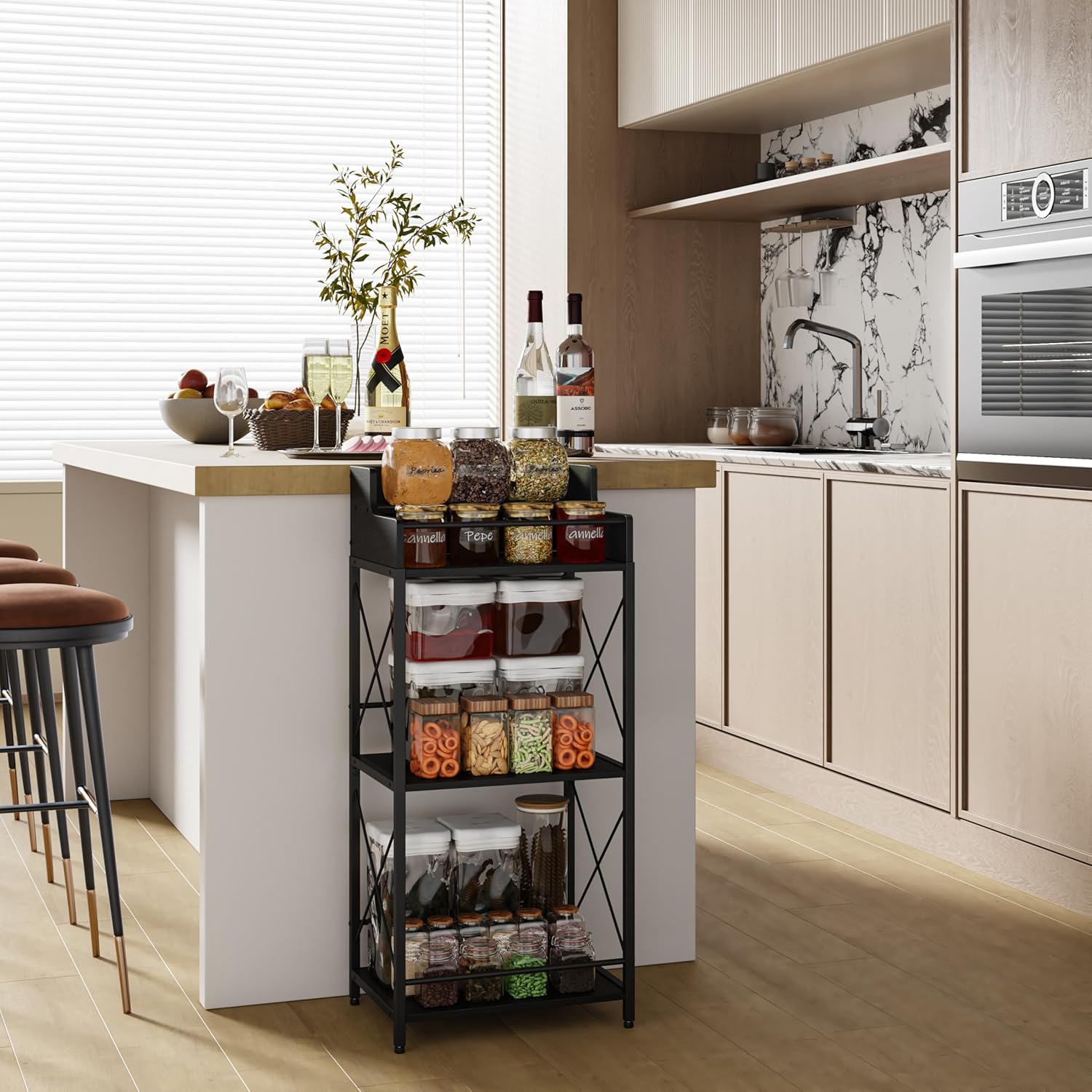 • VERSATILE STORAGE: 3-tier industrial style shelf with X-frame design, perfect for storing wine bottles, spirits, spices, or kitchen essentials